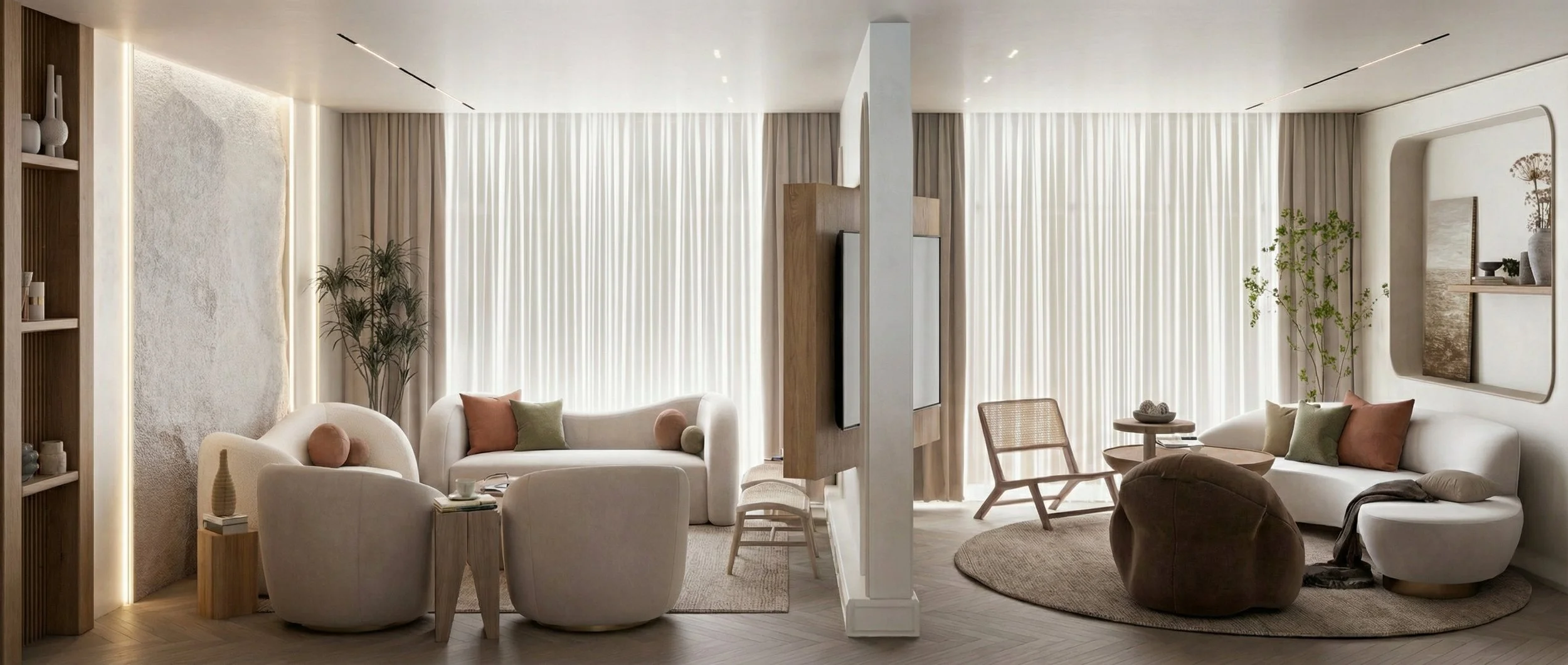 This project is an open living and dining space designed to feel calm, warm, and very comfortable for everyday life. We used soft neutral colors, natural wood, and gentle lighting to create a peaceful mood that helps the space feel relaxing and welcoming. The curved shapes of the sofas, chairs, and tables make the room feel softer and more cozy, while the simple clean lines keep it modern and tidy at the same time.